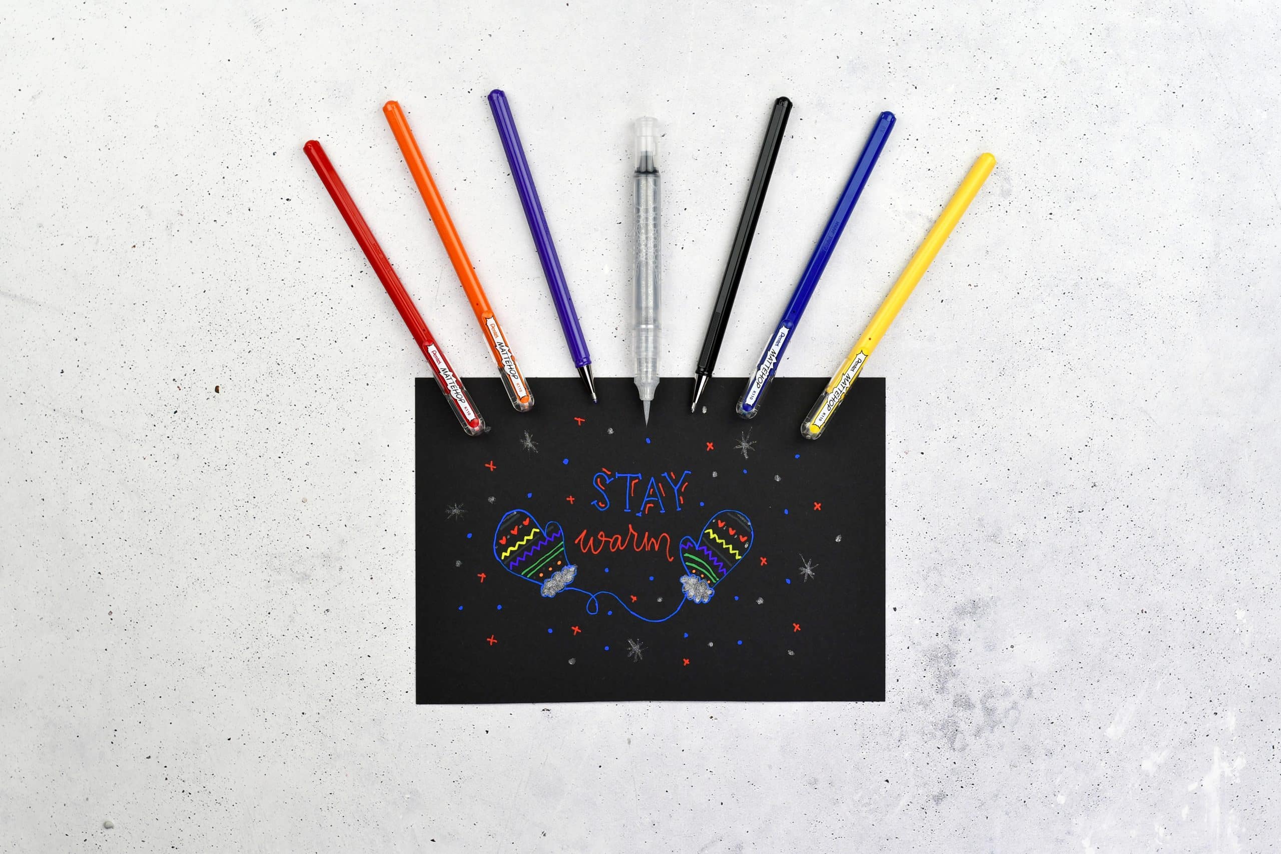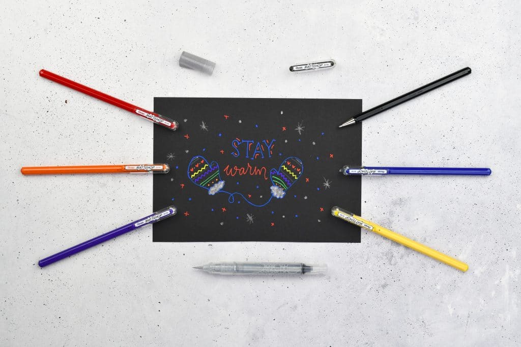 Mattehop gel pens and the silver glitter brush present endless options for new creativity. With the matt drying gel ink and the sparkles from the brush, great artwork with can be created.